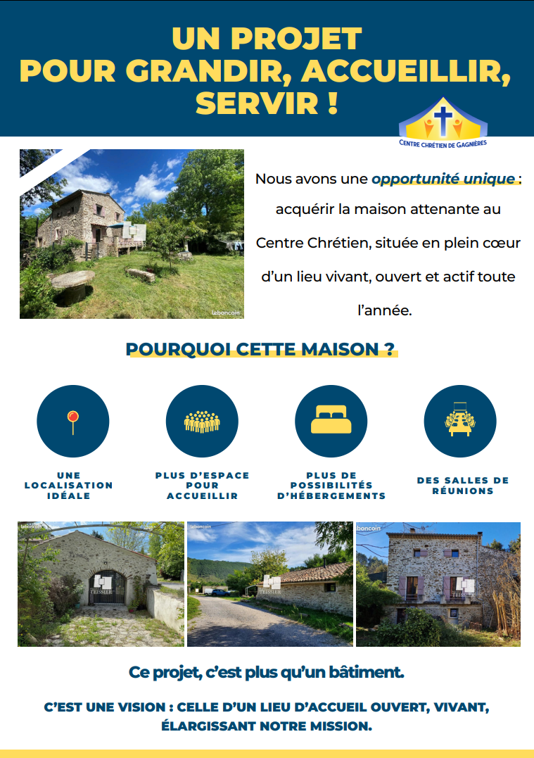 Aujourd'hui nous avons besoin de vous pour ce projet qui donnera aux infrastructures du centre une unité cohérente. Dans nos échanges avec différents responsables de sessions, il est ressorti qu'acquérir un "moulin" c'est en prévision d'une grande "récolte". Nous prenons avec foi cette parole que non seulement Dieu nous offre la grâce de pouvoir unifier la propriété après 55 ans de vie, mais que c'est un acte prophétique pour la saison d'acquérir un lieu nommé "Le Moulin" en prévision d'une grande moisson proche.