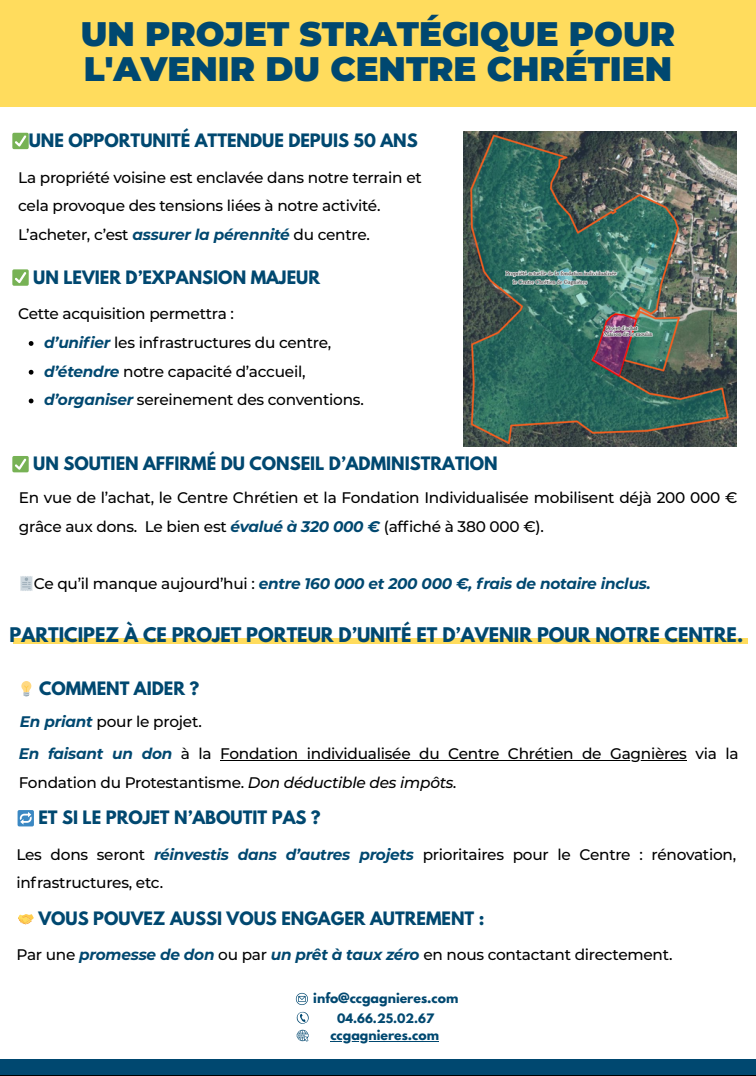 Vous pouvez dès à présent participer à cette aventure en effectuant un don, déductible des impôts, via la Fondation du Protestantisme, en le fléchant spécifiquement au bénéfice du Centre Chrétien et à l'achat du moulin en le mentionnant dans l'intitulé du virement ou au dos du chèque.